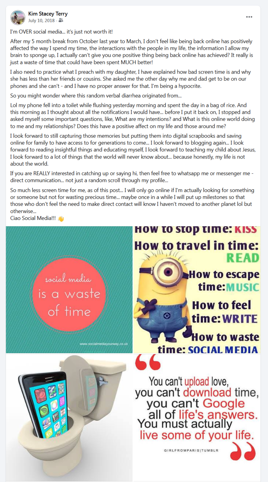 “Hey All! Decided to go #offline for a while #nomoresocialmedia #takingabreak #finerthings #disconnecttoconnect #unplug #moresociallessmedia Ciao”