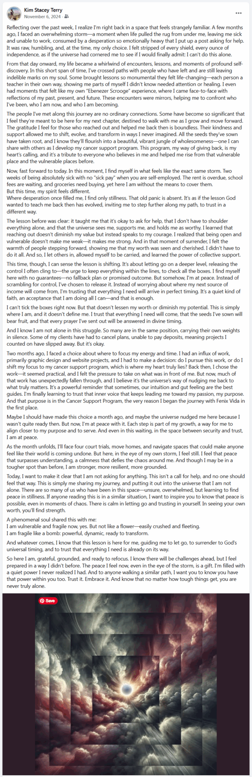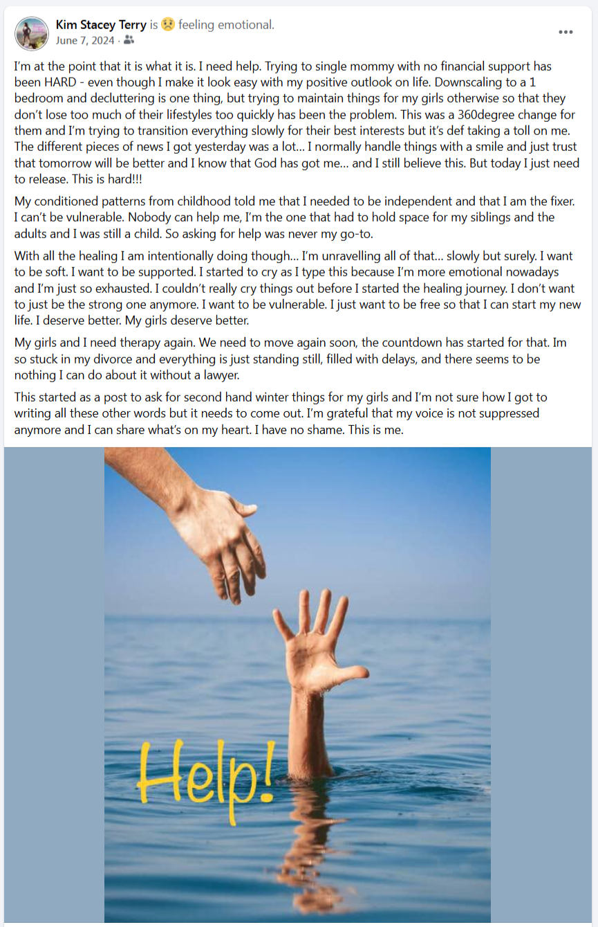 Fast forward to June 2024. After a year of holding it all together, I hit another breaking point as my body crashed. I was exhausted, raising my daughters alone with no consistent financial support, moving from place to place, and carrying the weight of transition on my shoulders.